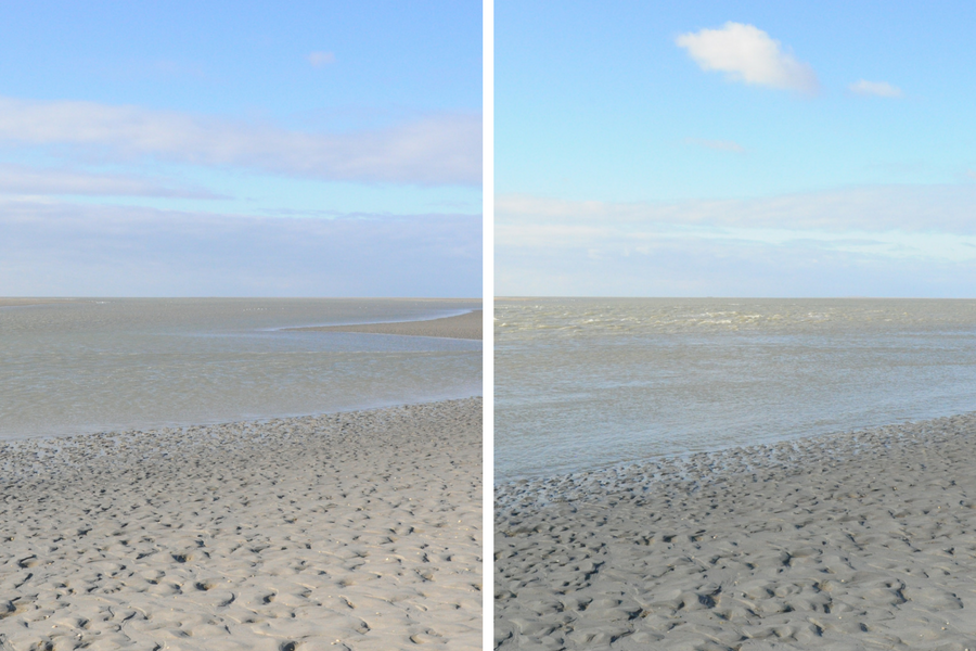 Après un moment, on commence à apercevoir au loin la vague de la marée qui arrive. En l’espace de quelques minutes, l’eau arrive à nos pieds. Au passage, les oiseaux délogés s’envolent en groupe, et leur plumage bicolore blanc et noir/ marron fait des effets de lumière assez magiques, assez similaire à de gros bancs de poissons comme on peut les voir en plongée.