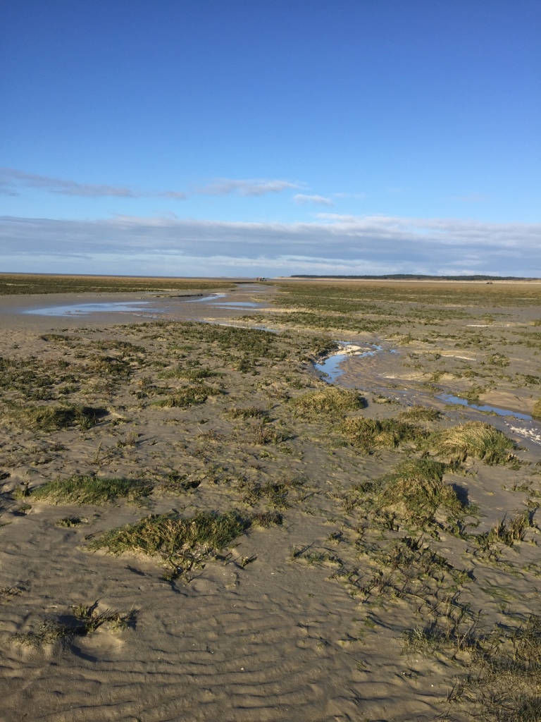 Au début, on est sur un banc de sable et d’herbe, qui sera d’ici quelques heures complètement recouvert par la mer. On marche au rythme des histoires de la baie, jusqu’à trouver un point de chute où s’arrêter quelques temps pour poser la longue vue et s’essayer aux jumelles. on découvre plusieurs espèces d’oiseaux, sédentaires ou migrateurs, dont je n’ai pas retenu les noms :)