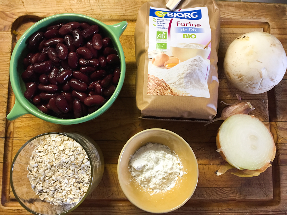 J’ai adapté la recette pour qu’elle soit végane, car à la base il utilisait de l’œuf comme liant, et j’y ajoute des petits légumes pour le fun.